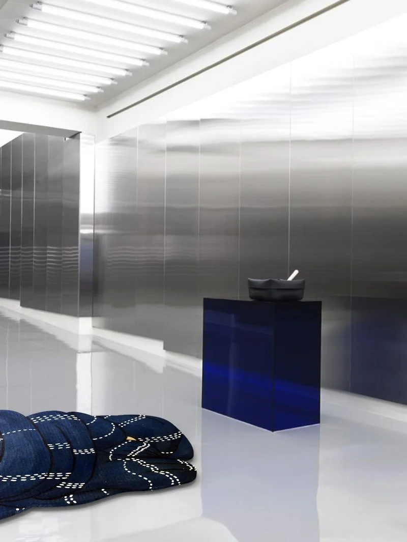 During a project with Japanese artisans, I conceived the design of this rug. Inspired by the deep indigo hues and the art of Boro, it represents the abandoned kimono of a warrior, known in Japanese as Senshi. It can be placed on the floor or hung on the wall. Made of wool and dyed with natural indigo pigments, it is crafted in France by the Pinton manufactory, masters of a centuries-old tradition in the purest Aubusson carpet and tapestry art. The rug was exhibited in 2023 at Milan Design Week, then in Paris and Berlin. In 2025, a larger version was acquired by the Mobilier National.