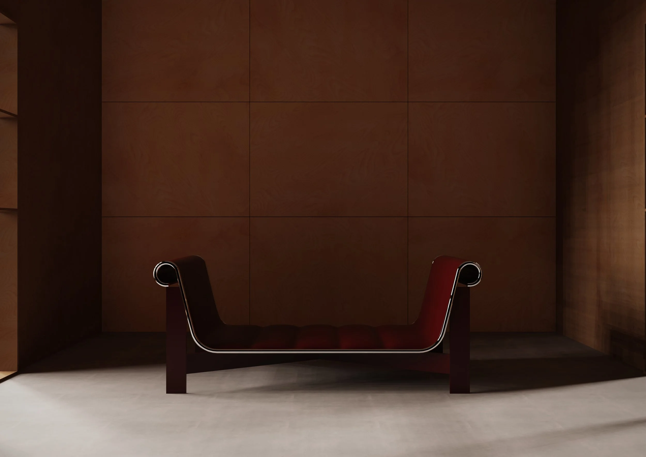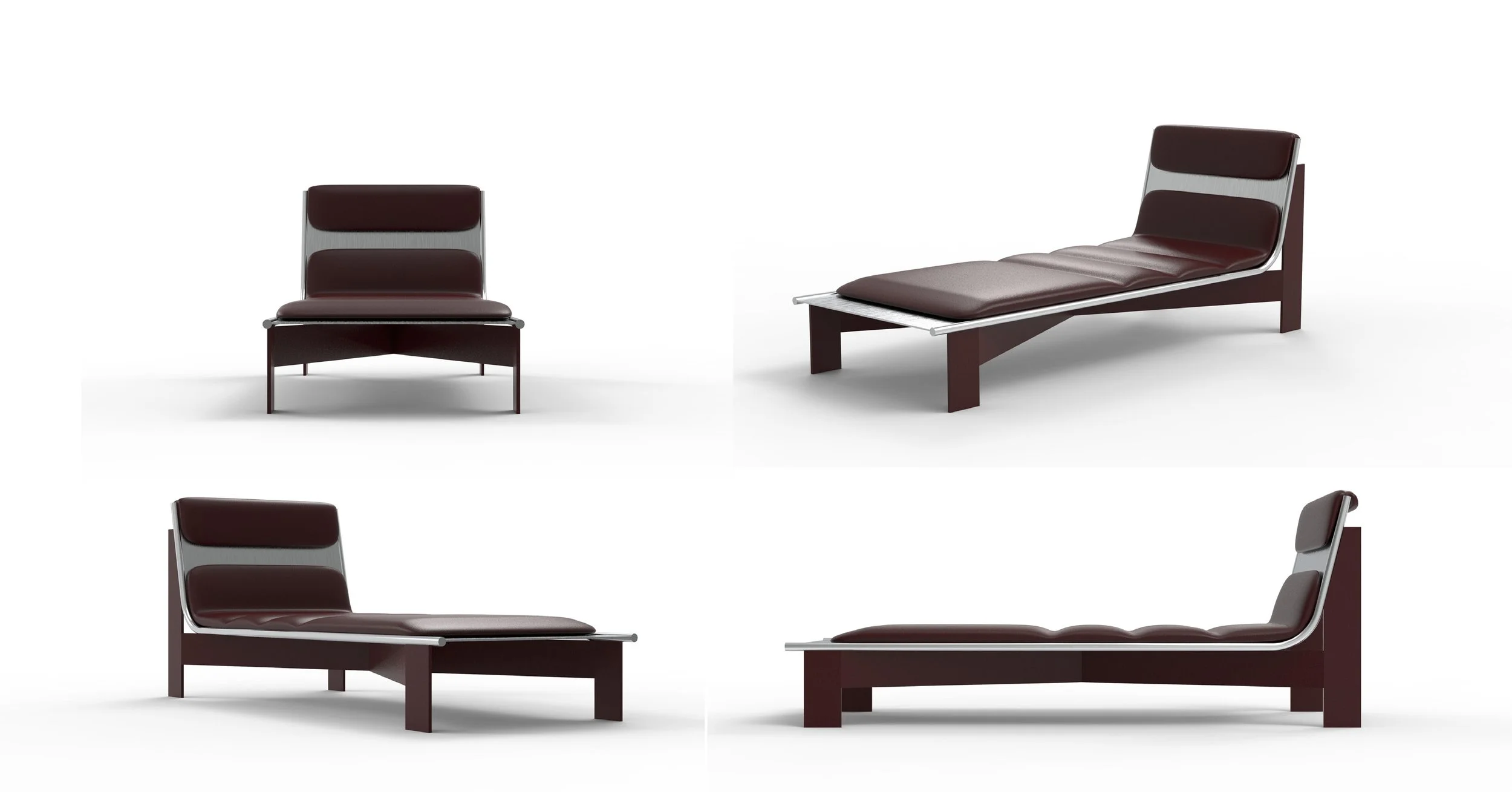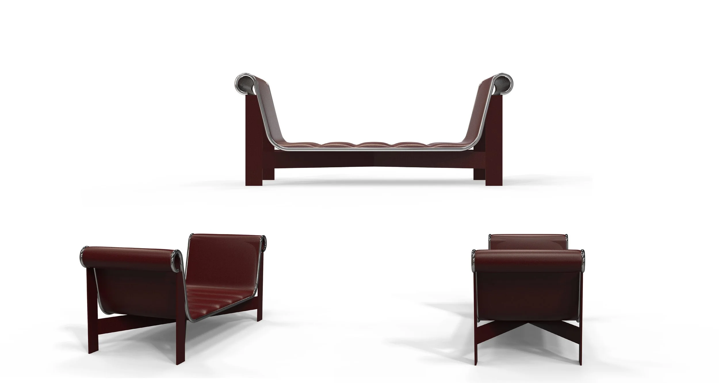 This lounge chair reinterprets the Roman kline : the reclining daybed traditionally used during banquets - through a contemporary and minimal approach. The design translates this historical typology into an industrial language, combining clean lines, geometric clarity, and structural honesty. The collection exists in two versions: Single-support version: A streamlined interpretation with one raised end, evoking the traditional asymmetry of the Roman kline. Dual-support version: A symmetrical variation with two raised ends, allowing the user to recline in either direction or sit with lateral support, offering greater versatility and comfort. Both versions share the same construction principle: a welded metal frame supporting a seat made from a single bent metal sheet, reinforced by a tubular metal border. The metal shell is upholstered in leather to enhance comfort while intentionally revealing parts of the underlying structure. With balanced proportions and a sculptural presence, the lounge chair transforms an ancient code of rest into a flexible and contemporary resting object.